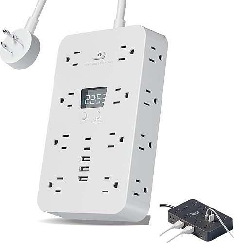 16-in-1 Power Strip with Switch & Surge Protection, Include 16 AC 3 USB Ports 2 USB and C 1 Clock, 1.5m/3m Extension Cord, for Home, Office, Dorm, Travel (Black,5ft)