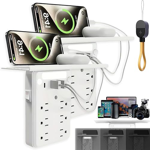 Wall Outlet Extender with Shelf Night, Relativelk Wall Outlet Extender with Surge Protector, Flat Plug Power Strip with 3 USB Ports, 1 Type-C, 6 AC Outlets, for Home Office Travel Outdoor (1PC)