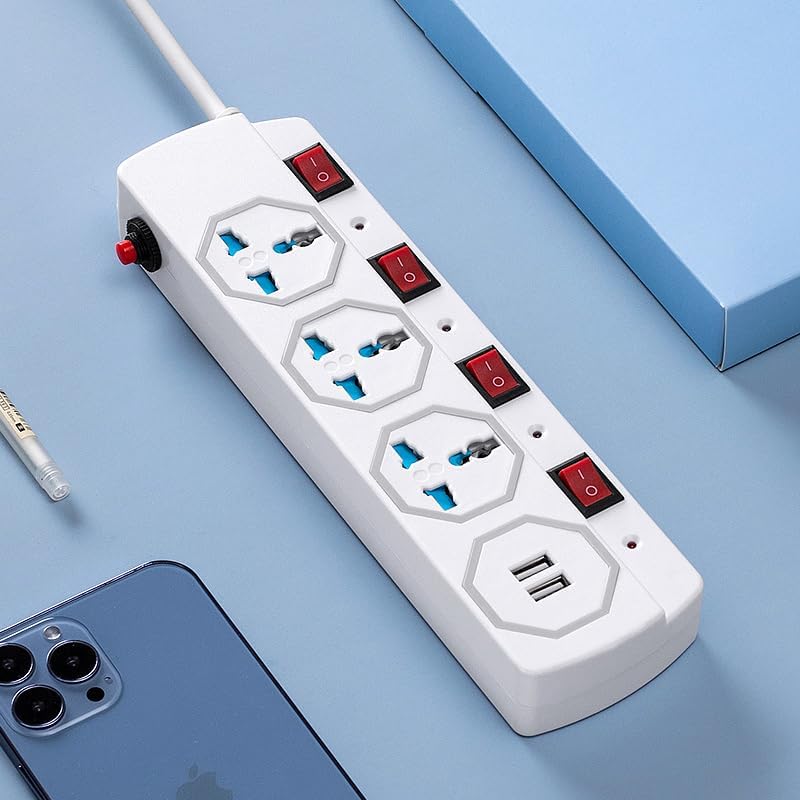 Universal Power Strip Surge Protector, 3 AC Outlets with Individual Switches, 2 USB Ports, White, Extension Cord