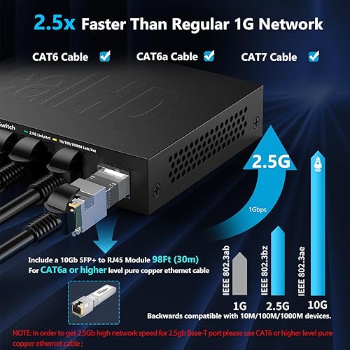 Real HD 8 Port 2.5G Managed Ethernet Network Switch, 1 x 10G SFP+ Port | 60G Bandwidth | Plug & Play | Fanless Metal Internet Multi-gigabit Switch | Include 10Gb SFP to RJ45 Module 98Ft (30m)