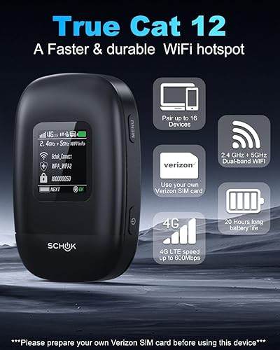 SCHOK 4G LTE Portable WiFi - Cat 12 Mobile Hotspot Travel Router, 600Mbps Download High Speed, Dual Bands (2.4GHz/5GHz), Compatible with Verizon, T-Mobile, AT&T, Supports 16 Connected Devices