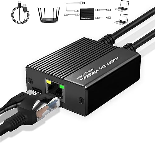 Ethernet Splitter 1 to 2 1000Mbps, Either Network Splitter with USB Power 1 in 2 Out Gigabit Dual LAN RJ45 Port Router Switch Work with Cat6/7/8 Cable [2 Devices Simultaneously Networking]