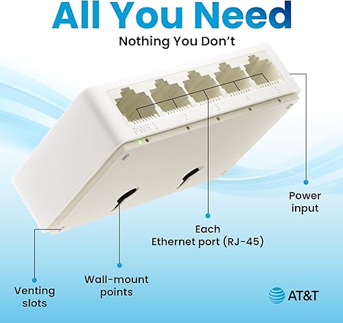 AT&T 5-Port Gigabit Ethernet Switch - Unmanaged LAN Hub for Home, Office, Gaming - Plug-and-Play Network Expander, Wired Internet Splitter, Compact & Energy Efficient - White