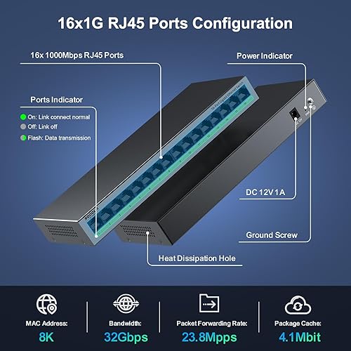 【Upgrade】 SODOLA 16 Port Gigabit Ethernet Switch,Plug & Play, Shielded Ports, Metal Housing, Fanless Design Unmanaged Network Switch