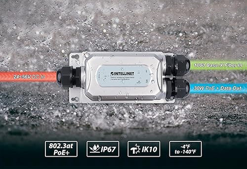 Intellinet Outdoor Vandalproof Gigabit Media Converter and PoE+ Injector – 30W Max Output, 1 1000Base-X SFP Port, 1 10/100/1000 RJ45 Port, IP67 & IK10 Rated – 3 Yr Mfg Warranty – 509213
