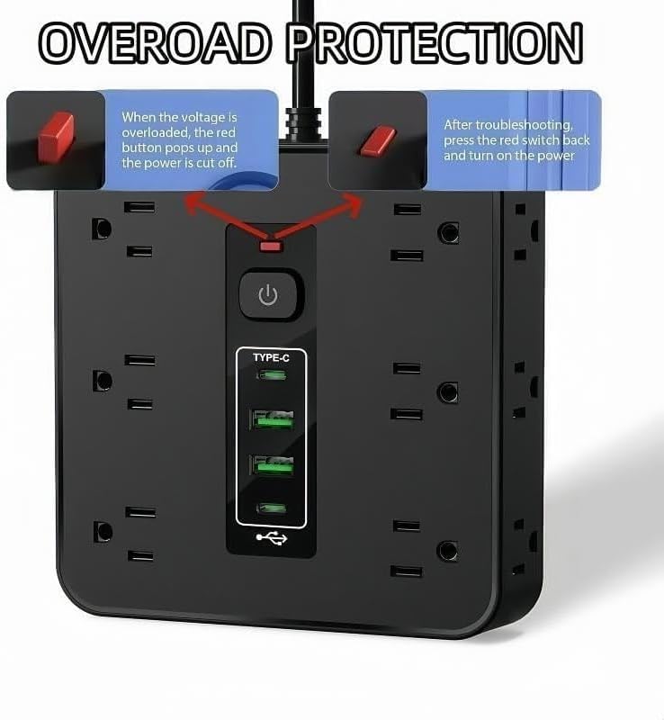 【Comprehensive Protection】:Equipped with a 16 in1 surge protector, this power strip guards against electrical spikes,ensuring devices remain safe during power fluctuations.
