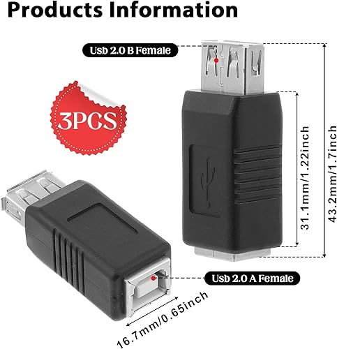 • Compact And Portable Adapter: product name is usb 2.0 af/bf plug type a female to type b female adapter connector.this zinc alloy and abs adapter connector, weighing 39g, measures 43.2mm x 16.7mm, offering a compact and portable solution for your connection needs. packing include 3 pieces.