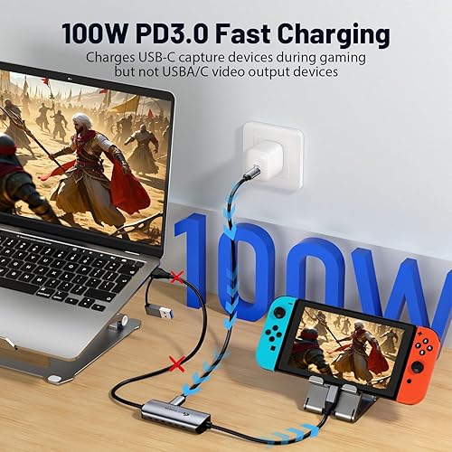 • 【PD100W Power Delivery】Equipped with PD 3.0 100W fast charging, this video capture devices ensures a stable power supply for long-duration use with high-performance devices. You can stream games while charging your USB-C port device simultaneously. Note: USB-A/C ports do not support charging. The usbc capture card may warm up slightly during use, but this is normal