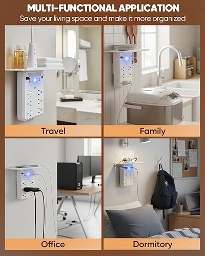• 【All-in-One Charging Station with Outlet Shelf】Keep essentials organized and powered! Our hub combines 6 AC outlets, 3 USB-A ports, and 1 USB-C port with a spacious, non-slip shelf perfect for phones, tablets, keys, or glasses. No more clutter—just a tidy and efficient charging space ideal for your desk, bedside, or office.