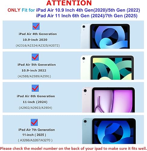 Perfect Compatibility: Specially designed for 11 inch New iPad Air 7th/6th Generation M3 (2025) /M2 (2024) (Model Number: A3266, A3267, A3270, A2902, A2903, A2904 ) / 10.9 inch iPad Air 5th Generation 2022 (Model Number: A2588 A2589 A2591) / 10.9 inch iPad Air 4th Generation 2020 (Model number: A2316 A2324 A2325 A2072). Not compatible with any other devices.