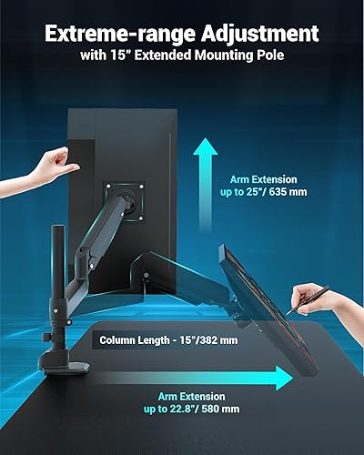 【With 15" Tall Pole】 This single ultrawide monitor mount offers unparalleled flexibility, allowing you to adjust the height(2.4-25"), rotation(360°), tilt(+90°/ -45°), and swivel(180°) of your monitor for the perfect viewing angle, whether for work, gaming, or multimedia entertainment.