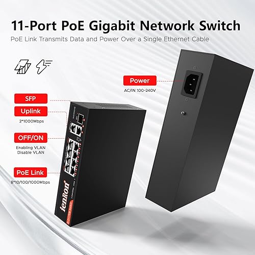 High-speed connectivity: 11-port Gigabit PoE switch with 8 PoE+ ports (802.3af/at), 2 uplink ports and 1 SFP fiber port; supports 20Gbps full-duplex bandwidth for IP cameras and wireless APs