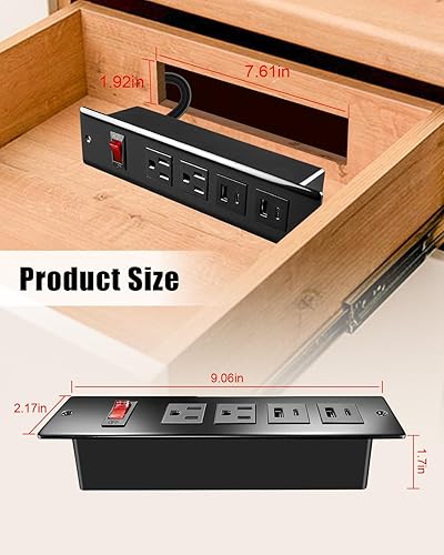 • Space-Saving In-Drawer Design: Compact and hidden in wide drawers or cabinets, this embedded power strip keeps your desk or countertop clutter-free. Ideal for bathroom vanities, kitchen drawers, bedside tables, and office desks
