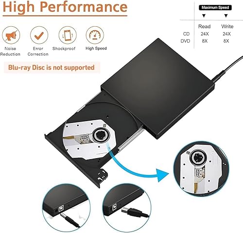 High Speed USB interface : CD ROM External Drive adopted advanced burning technology, supported DVD+R, DVD, CD-ROM, DVD-ROM, CD-R, CD-RW. High-speed USB interface for reliable use with transfer rates up to 480 Mbps. Enables rapid burning of CD/DVD media with 24x write speed for CD and 8x for DVD
