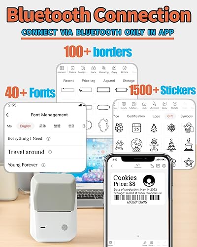 [ Powerful App ] - The App is downloaded from APP STORE or Google Play and supports bar-code, qr code, picture, scan code, multiple line text, Excel import, smart OCR scanner, massive vivid icons, easily create your own customized labels , preview and save record, improving efficiency.It can be Large-capacity continuous printing, which can complete 50-230 more than one continuous repeat printing.