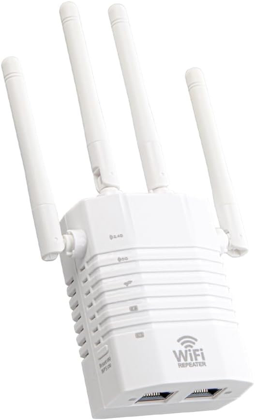 AC1200 WiFi Extender Signal Booster – Dual Band 2.4/5GHz Repeater, 1200Mbps, 10000 Sq Ft Coverage, 2× Gigabit Ethernet, 4 Antennas, 1-Year Replacement Warranty.