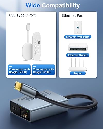 Easy to Set Up: Plug and work instantly, No driver needed. Just simply connect your Ethernet Adapter for Chromecast into Google TV USB Type C port and plug in an Ethernet cable directly from your router to activate and get a stable, high-speed Internet connection. (Additional Power cable is suggested for sufficient power supply via USB Type C port)