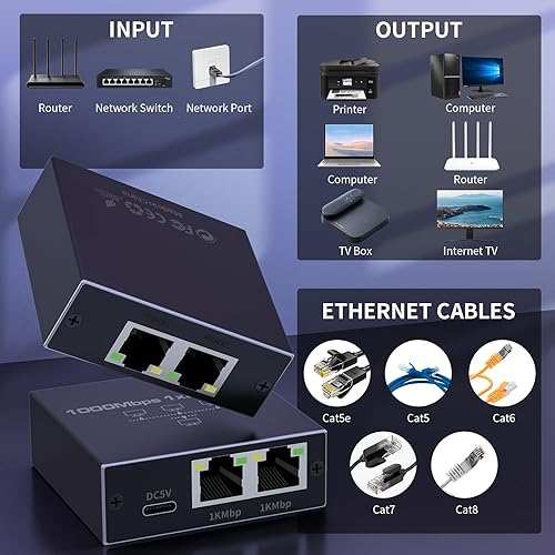 Ethernet Splitter 1 In 4 Out: Split one internet signal to two devices, the input can be connected to routers, network switches, network ports, and the output can be connected to TV boxes, computers, cameras, routers, laptops, printers and other devices. Compatible with ethernet cable Cat5/5e/6/7/8.