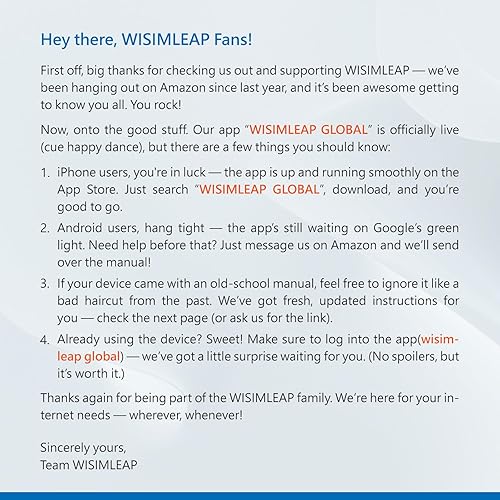 【Just for IOS phone】The app is up and running smoothly on the App Store. Just search "WISIMLEAP GLOBAL", download, and you're good to go. Android users, we didn't forget you,the app is still waiting for google paly approval ,if you really need, pls send email via amazon.