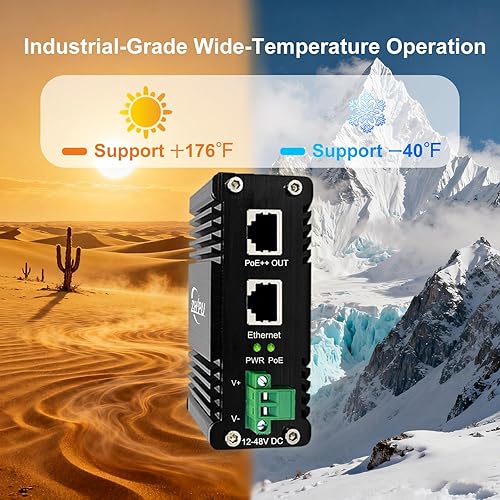 [Industrial Grade Quality]– The PoE adapter uses industrial grade components and aluminum housing, it can work at wide range temperature -40°C to 75°C (-40°F to 167°F). You can use it in outdoor harsh environment.