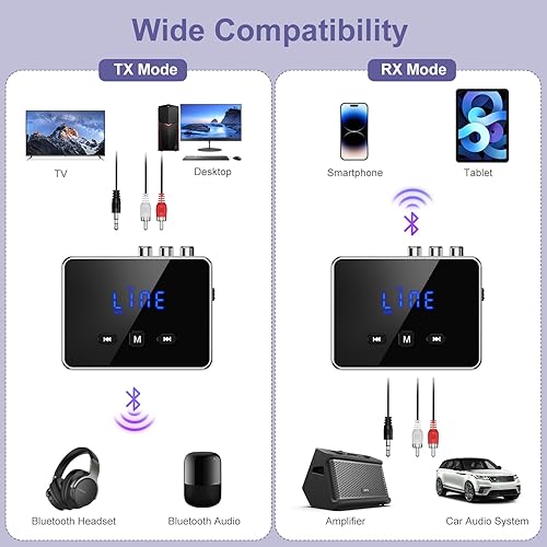 MultiFunctional Interface - The bluetooth transmitter for tv can connect effortlessly with other devices via AUX cable, RCA cable, coaxial cable, or fiber optic cable (AUX cable, RCA cable, and USB charging cable are included) to fulfill all your connection needs seamlessly. Additionally, it comes with a HD display screen that clearly shows the current working mode (TX/RX/TF/USB) and the connection method (AUX/OPT/COA).