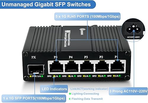 6-Port Gigabit Configuration: This fiber optic switch features 5 RJ45 Gigabit ports and 1 Gigabit SFP slot (supports 100M/1G modules). It offers automatic negotiation and MDI/MDIX functions, adapting to 100G rates with a 12G switching capacity for reliable, high-speed data transmission