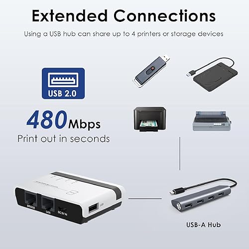 Expansion Capability: By utilizing the USB Hub feature, this network print server supports the sharing of up to 4 printers or storage devices simultaneously, improving device utilization and reducing the cost of additional hardware purchases