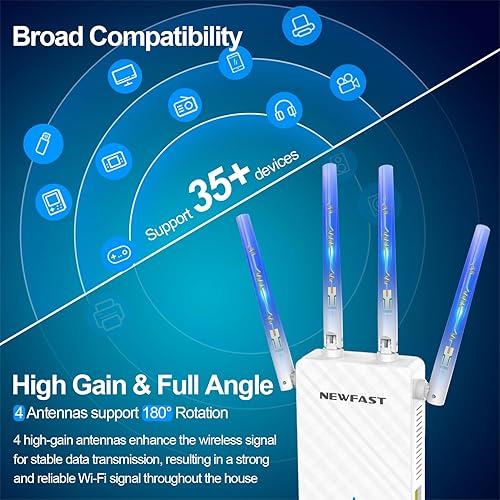 【Stable and Fast WiFi Transmission】NEWFAST WiFi booster features a 2.4 GHz multi-core processor and 4 high gain antennas that can be rotated 180°,which can maximize your network quality and reduce data transmission losses,allowing you to enjoy 4K video,gaming, and video conferencing at home