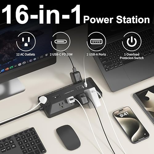 Rich and Compatible Power Strip: This power strip have 12 AC outlets and 4 USB ports (2 USB-C PD20W + 2 USB-A 18W), meets needs for laptops, phones, and appliances