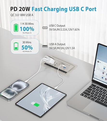【Versatile & Easy Installation】Install effortlessly without the need for wiring or soldering. The 6-foot power cord offers flexible placement in offices, homes, hotels, schools, or conference rooms, making it ideal for modern desks seeking a clean, clutter-free charging solution.