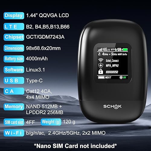 Comment on "SCHOK 4G LTE Portable WiFi - Cat 12 Mobile Hotspot Travel Router, 600Mbps Download High Speed, Dual Bands (2.4GHz/5GHz), Compatible with Verizon, T-Mobile, AT&T, Supports 16 Connected Devices"