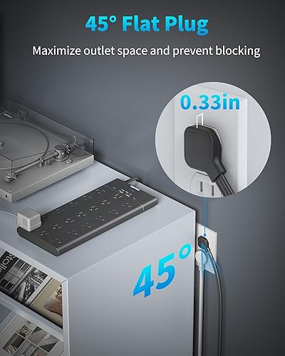【Mountable Design & Flat Plug】This extension cord with multiple outlets includes T-shaped mounting holes for easy installation on walls, preventing cord tangling. Our ultra-thin flat plug design (only 0.33 inches) allows the extension cord to easily fit behind furniture. The 45-degree right-angle design prevents it from blocking other plugs.