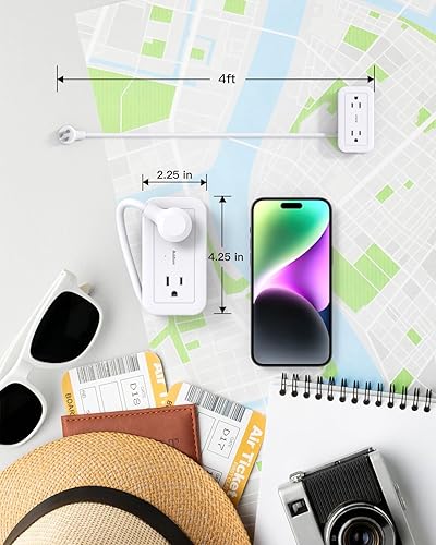 【Easy to Carry & Wrap-Around Extension Cord 】Small size (4.25 x 2.25 x 1.25 in) with flexible 4ft retractable wrap-around extension cord, which is designed to be easily packed into handbags, backpacks and luggage, without the hassle of managing the wires