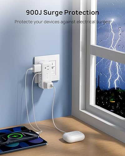 10-IN-1 Multi Plug Outlet Extender: With 6 AC Outlets, 2 USB-C Ports and 2 USB-A Ports on 3 different sides, this rotating outlet splitter allows you to power up to 10 devices simultaneously, great for plugging in your laptop, phone, watch, lamps, or other electric devices